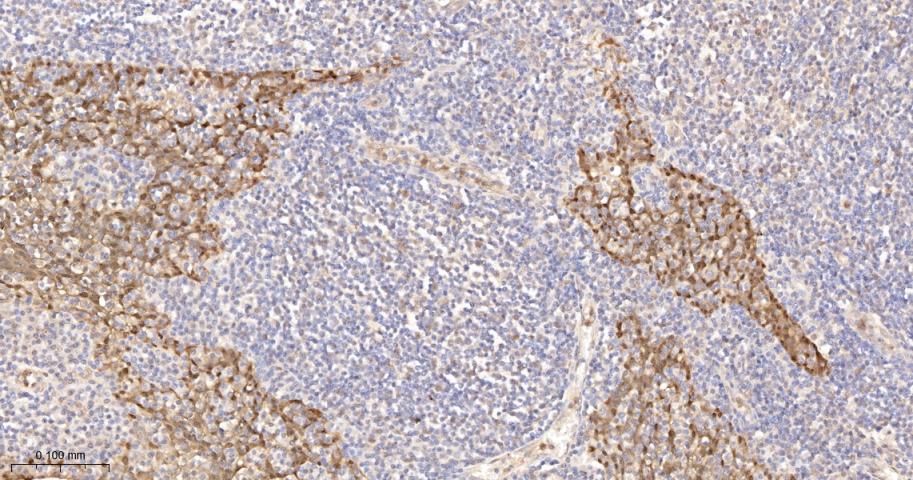 Paraformaldehyde-fixed, paraffin embedded Human Tonsil; Antigen retrieval by boiling in sodium citrate buffer (pH6.0) for 15 min; The section was incubated with 14-3-3 sigma Monoclonal Antibody, Unconjugated (bsm-52005R) at 1:200 overnight at 4°C, followed by conjugation to the bs-0295G-HRP and DAB (C-0010) staining.