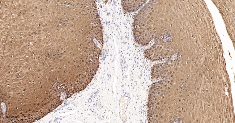 Paraformaldehyde-fixed, paraffin embedded Human Esophagus; Antigen retrieval by boiling in sodium citrate buffer (pH6.0) for 15 min; The section was incubated with 14-3-3 sigma Monoclonal Antibody, Unconjugated (bsm-52005R) at 1:200 overnight at 4°C, followed by conjugation to the bs-0295G-HRP and DAB (C-0010) staining.