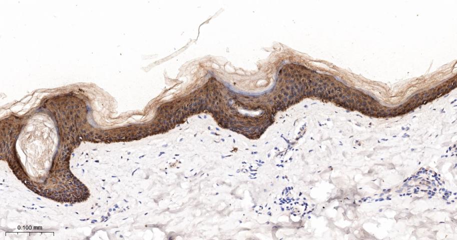 Paraformaldehyde-fixed, paraffin embedded Human Skin; Antigen retrieval by boiling in sodium citrate buffer (pH6.0) for 15 min; The section was incubated with 14-3-3 sigma Monoclonal Antibody, Unconjugated (bsm-52005R) at 1:200 overnight at 4°C, followed by conjugation to the bs-0295G-HRP and DAB (C-0010) staining.