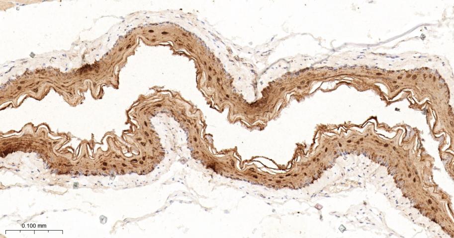 Paraformaldehyde-fixed, paraffin embedded Mouse Esophagus; Antigen retrieval by boiling in sodium citrate buffer (pH6.0) for 15 min; The section was incubated with 14-3-3 sigma Monoclonal Antibody, Unconjugated (bsm-52005R) at 1:200 overnight at 4°C, followed by conjugation to the bs-0295G-HRP and DAB (C-0010) staining.