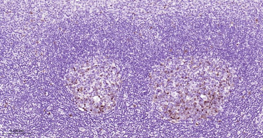 Paraformaldehyde-fixed, paraffin embedded Human Tonsil; Antigen retrieval by boiling in sodium citrate buffer (pH6.0) for 15 min; Antibody incubation with Aurora B Monoclonal Antibody, Unconjugated(bsm-52019R) at 1:200 overnight at 4°C, followed by conjugation to the bs-0295G-HRP and DAB (C-0010) staining.