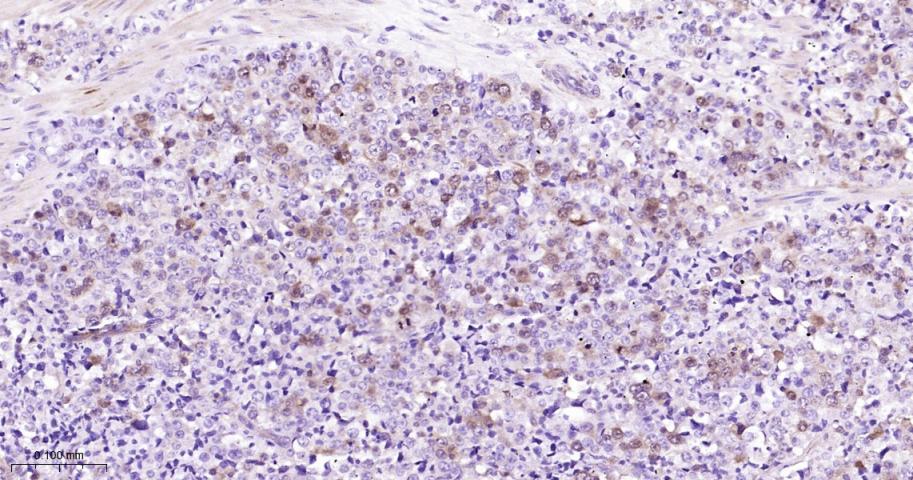 Paraformaldehyde-fixed, paraffin embedded Human Prostate Tumor; Antigen retrieval by boiling in sodium citrate buffer (pH6.0) for 15 min; Antibody incubation with CDK1 Monoclonal Antibody, Unconjugated(bsm-52026R) at 1:200 overnight at 4°C, followed by conjugation to the bs-0295G-HRP and DAB (C-0010) staining.
