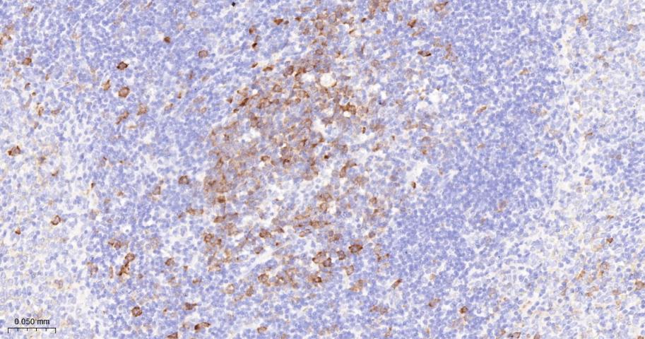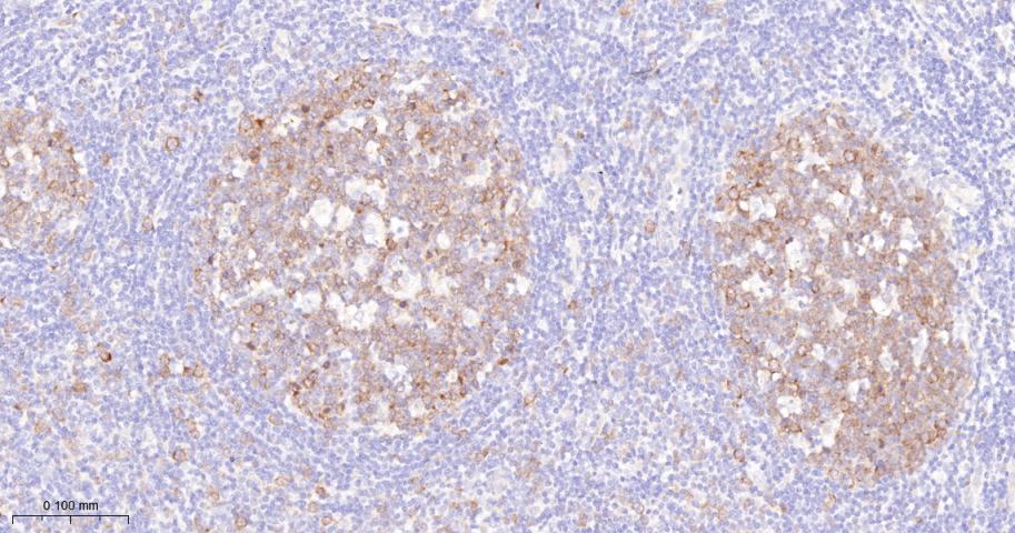 Paraformaldehyde-fixed, paraffin embedded Human Tonsil; Antigen retrieval by boiling in sodium citrate buffer (pH6.0) for 15 min; The section was incubated with CDK1 Monoclonal Antibody, Unconjugated (bsm-52026R) at 1:200 overnight at 4°C, followed by conjugation to the bs-0295G-HRP and DAB (C-0010) staining.