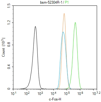 The Hela (treated with 200 nM PMA for 4 hours)(H) cells were fixed with 4% PFA (10 min at r.t.) and then permeabilized with 90% ice-cold methanol for 20 min at -20℃,the cells then were incubated in 5%BSA to block non-specific protein-protein interactions (30 min at r.t.).Primary Antibody (green):Rabbit Anti- c-Fos antibody (bsm-52034R): 1 μg/10^6 cells; Secondary Antibody (white blue): Goat anti-Rabbit IgG-FITC (bs-60295G-FITC): 1 μg/test. Isotype Control (orange): Rabbit IgG (bs-0295P). Blank control (black): PBS. Acquisition of 20,000 events was performed.