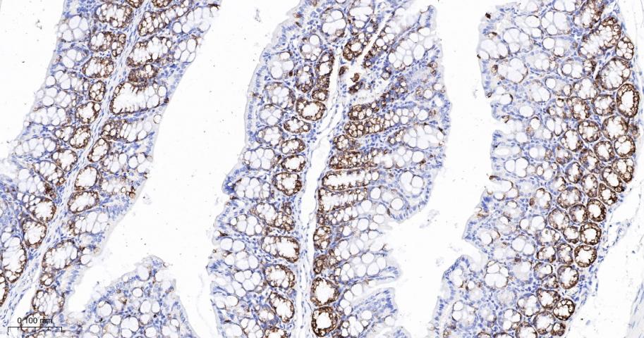 Paraformaldehyde-fixed, paraffin embedded Mouse Colon; Antigen retrieval by boiling in sodium citrate buffer (pH6.0) for 15 min; The section was incubated with Cyclin B2 Monoclonal Antibody, Unconjugated (bsm-52045R) at 1:200 overnight at 4°C, followed by conjugation to the bs-0295G-HRP and DAB (C-0010) staining.