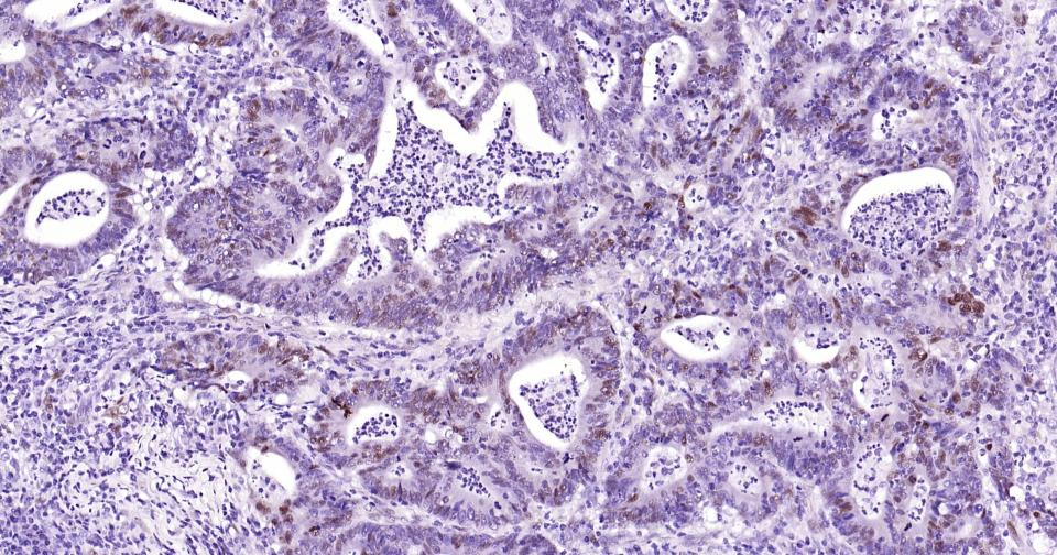 Paraformaldehyde-fixed, paraffin embedded Human Colon Cancer; Antigen retrieval by boiling in sodium citrate buffer (pH6.0) for 15 min; Antibody incubation with Cyclin D1 Monoclonal Antibody, Unconjugated(bsm-52046R) at 1:200 overnight at 4°C, followed by conjugation to the SP Kit (Rabbit, SP-0023) and DAB (C-0010) staining.