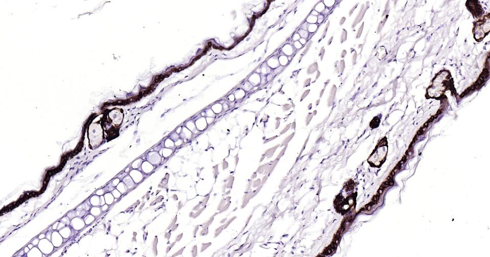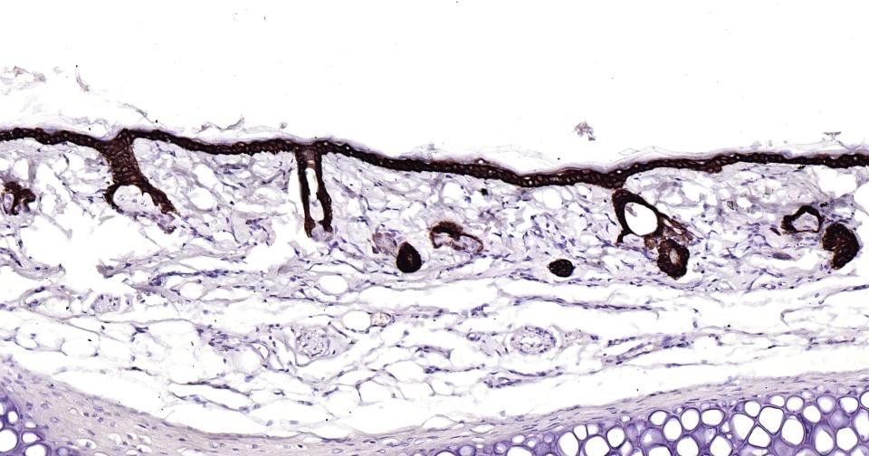 Paraformaldehyde-fixed, paraffin embedded Rat Skin; Antigen retrieval by boiling in sodium citrate buffer (pH6.0) for 15 min; Antibody incubation with Cytokeratin 15 Monoclonal Antibody, Unconjugated(bsm-52055R) at 1:200 overnight at 4°C, followed by conjugation to the bs-0295G-HRP and DAB (C-0010) staining.