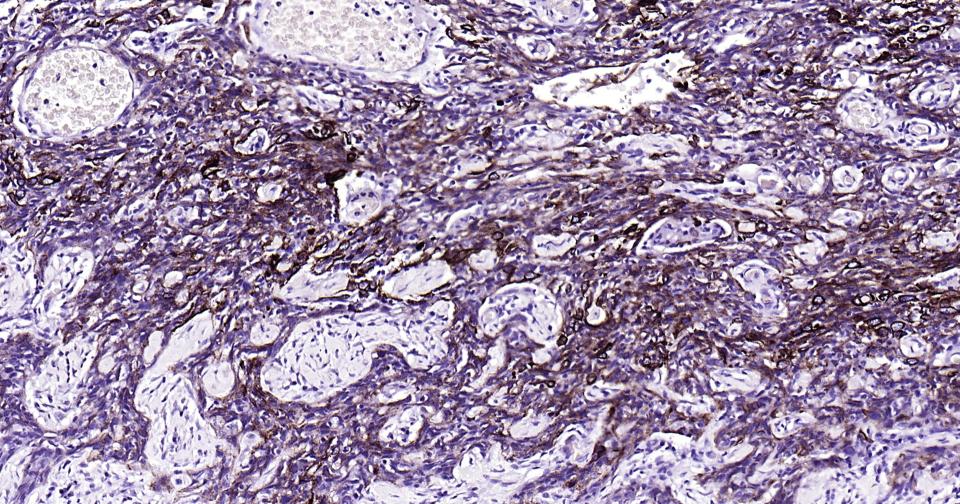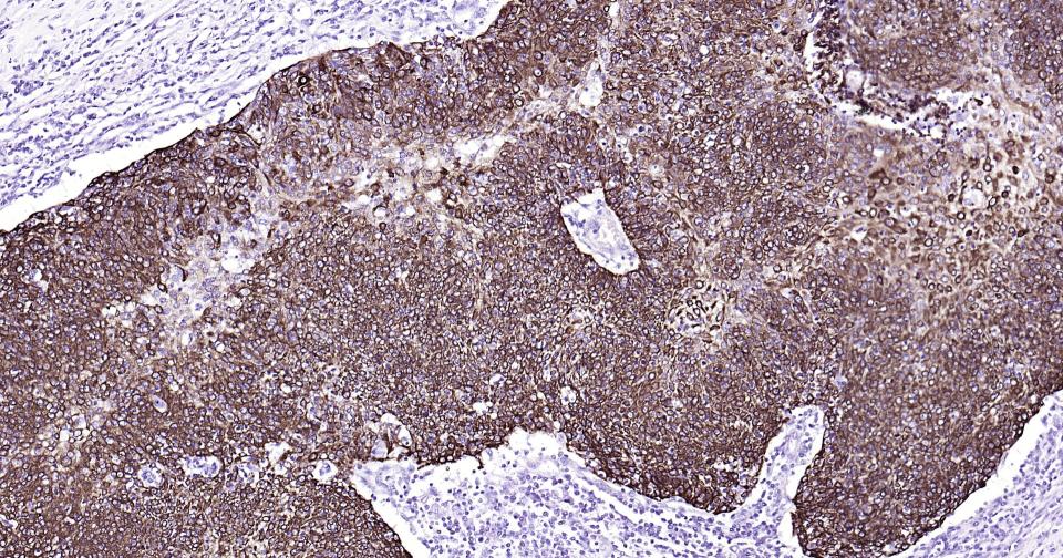 Paraformaldehyde-fixed, paraffin embedded Human Cervical Cancer; Antigen retrieval by boiling in sodium citrate buffer (pH6.0) for 15 min; Antibody incubation with Cytokeratin 15 Monoclonal Antibody, Unconjugated(bsm-52055R) at 1:200 overnight at 4°C, followed by conjugation to the bs-0295G-HRP and DAB (C-0010) staining.