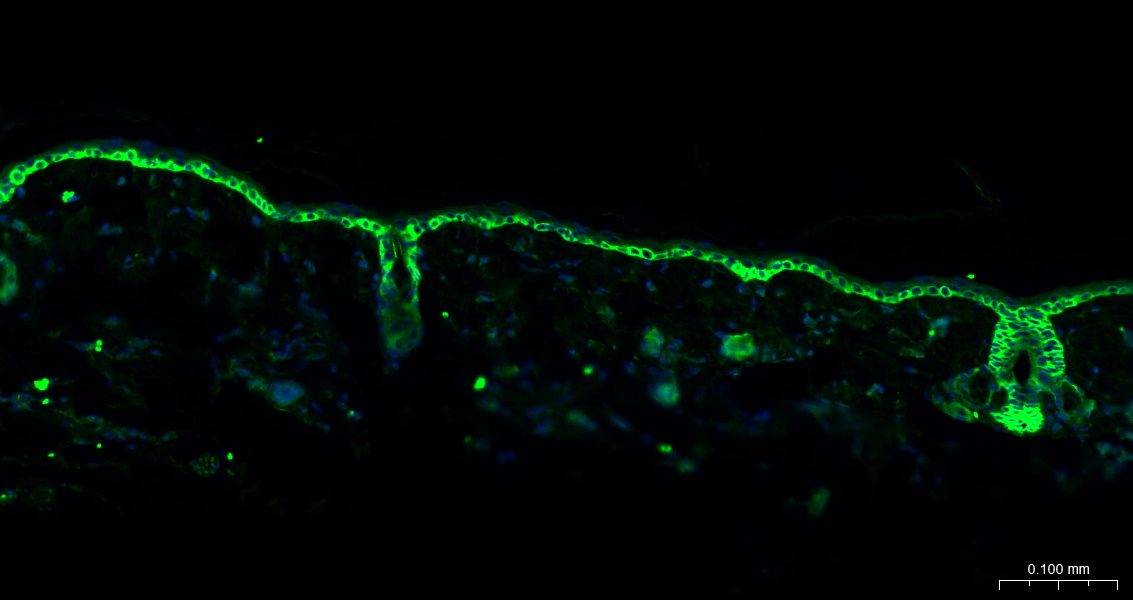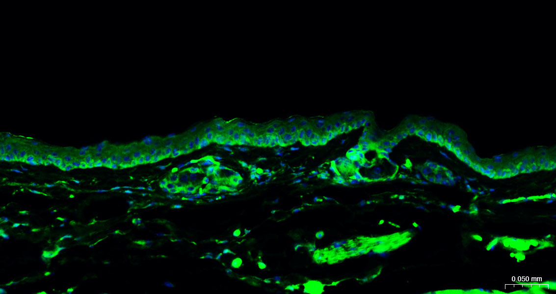 Paraformaldehyde-fixed, paraffin embedded Mouse skin; Antigen retrieval by boiling in sodium citrate buffer (pH6.0) for 15 min; Antibody incubation with Cytokeratin 15 Monoclonal Antibody, Unconjugated (bsm-52055R) at 1:200 overnight at 4°C. Followed by conjugated Goat Anti-Rabbit IgG antibody (green, bs-0295G-BF488), DAPI (blue, C02-04002) was used to stain the cell nuclei.