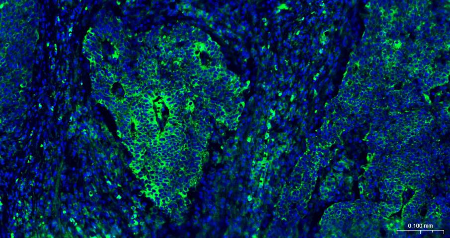 Paraformaldehyde-fixed, paraffin embedded Human skin cancer; Antigen retrieval by boiling in sodium citrate buffer (pH6.0) for 15 min; Antibody incubation with Cytokeratin 15 Monoclonal Antibody, Unconjugated (bsm-52055R) at 1:200 overnight at 4°C. Followed by conjugated Goat Anti-Rabbit IgG antibody (green, bs-0295G-BF488), DAPI (blue, C02-04002) was used to stain the cell nuclei.