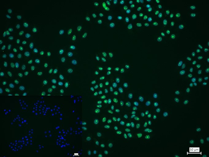4% Paraformaldehyde-fixed HepG2 (H) cell; Triton X-100 at r.t. for 20 min; Antibody incubation with (HDAC8) monoclonal Antibody, unconjugated (bsm-52088R) 1:200, 90 min at 37°C; followed by conjugated Goat Anti-Rabbit IgG antibody (green, bs-60295G-BF488) at 37°C for 90 min, DAPI (blue, C02-04002) was used to stain the cell nuclei. PBS instead of the primary antibody was used as the blank control.