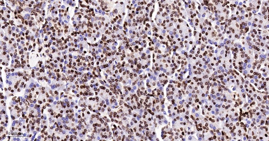Paraformaldehyde-fixed, paraffin embedded Human Pancreas; Antigen retrieval by boiling in sodium citrate buffer (pH6.0) for 15 min; The section was incubated with Histone H1.0 Monoclonal Antibody, Unconjugated (bsm-52095R) at 1:200 overnight at 4°C, followed by conjugation to the bs-0295G-HRP and DAB (C-0010) staining.