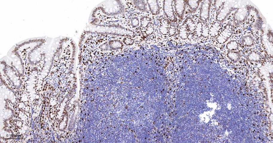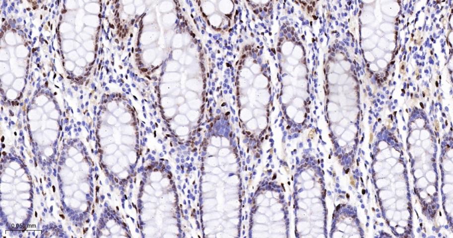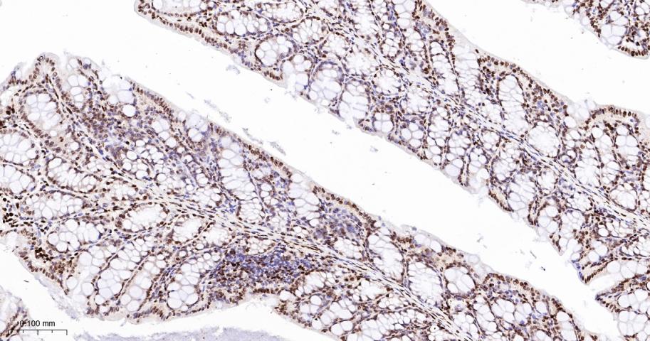 Paraformaldehyde-fixed, paraffin embedded Mouse Colon; Antigen retrieval by boiling in sodium citrate buffer (pH6.0) for 15 min; The section was incubated with Histone H1.0 Monoclonal Antibody, Unconjugated (bsm-52095R) at 1:200 overnight at 4°C, followed by conjugation to the bs-0295G-HRP and DAB (C-0010) staining.
