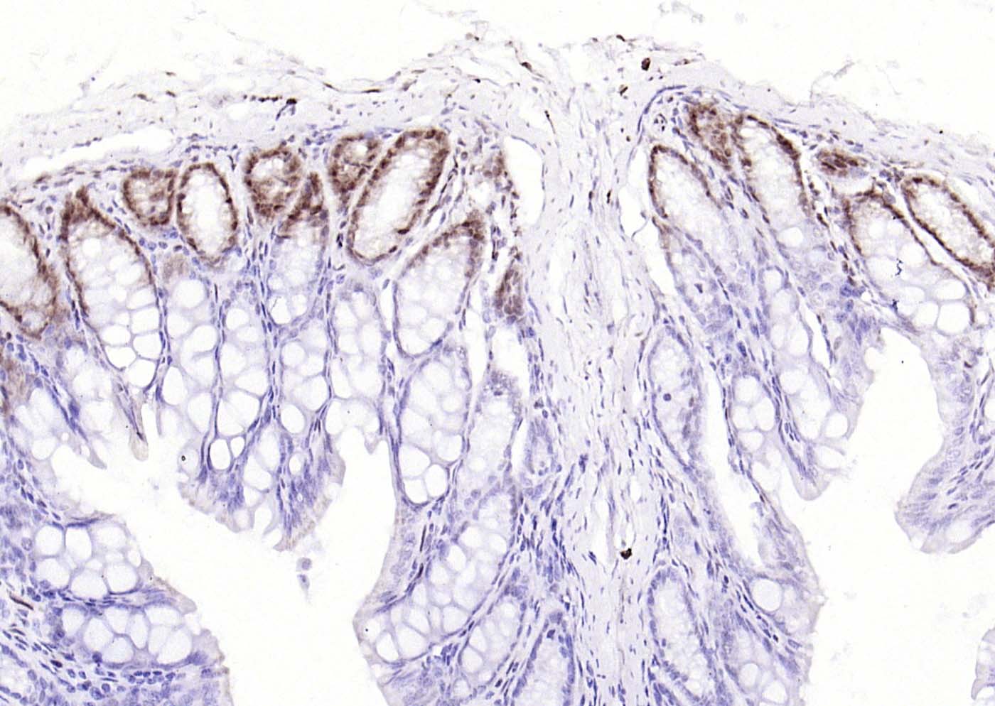 Paraformaldehyde-fixed, paraffin embedded (rat colon); Antigen retrieval by boiling in sodium citrate buffer (pH6.0) for 15min; Block endogenous peroxidase by 3% hydrogen peroxide for 20 minutes; Blocking buffer (normal goat serum) at 37°C for 30min; Antibody incubation with (phospho-ATF2 (Thr71)) Monoclonal Antibody, Unconjugated (bsm-52134R) at 1:200 overnight at 4°C, followed by operating according to SP Kit(Rabbit) (sp-0023) instructionsand DAB staining.