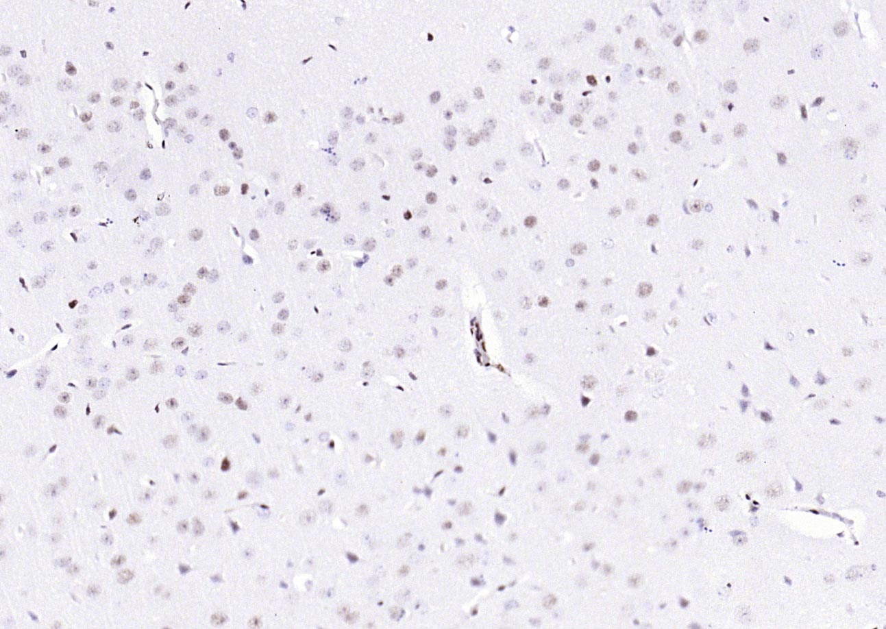 Paraformaldehyde-fixed, paraffin embedded (mouse brain); Antigen retrieval by boiling in sodium citrate buffer (pH6.0) for 15min; Block endogenous peroxidase by 3% hydrogen peroxide for 20 minutes; Blocking buffer (normal goat serum) at 37°C for 30min; Antibody incubation with (phospho-ATF2 (Thr71)) Monoclonal Antibody, Unconjugated (bsm-52134R) at 1:200 overnight at 4°C, followed by operating according to SP Kit(Rabbit) (sp-0023) instructionsand DAB staining.