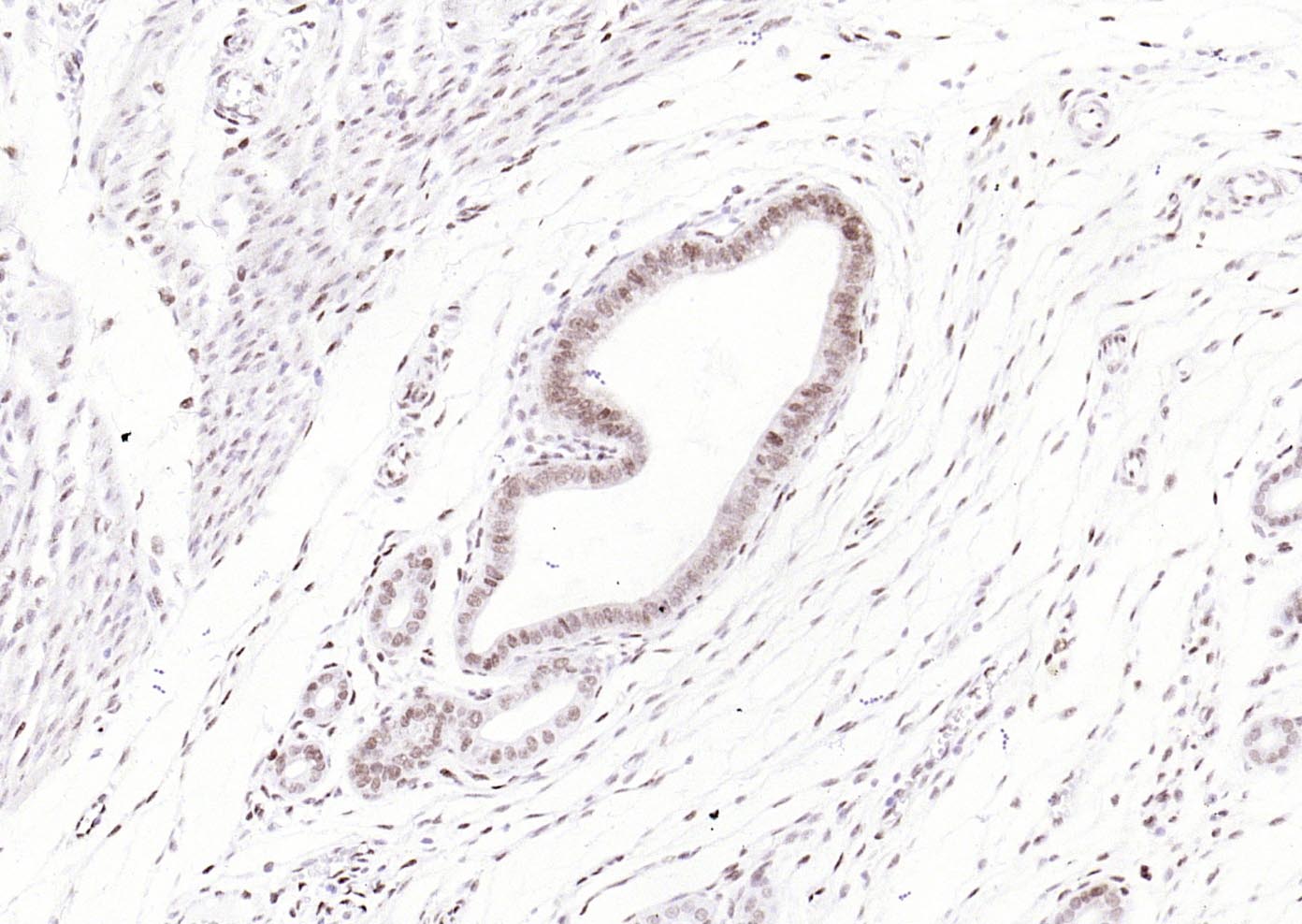 Paraformaldehyde-fixed, paraffin embedded (rat uterus); Antigen retrieval by boiling in sodium citrate buffer (pH6.0) for 15min; Block endogenous peroxidase by 3% hydrogen peroxide for 20 minutes; Blocking buffer (normal goat serum) at 37°C for 30min; Antibody incubation with (phospho-ATF2 (Thr71)) Monoclonal Antibody, Unconjugated (bsm-52134R) at 1:200 overnight at 4°C, followed by operating according to SP Kit(Rabbit) (sp-0023) instructionsand DAB staining.