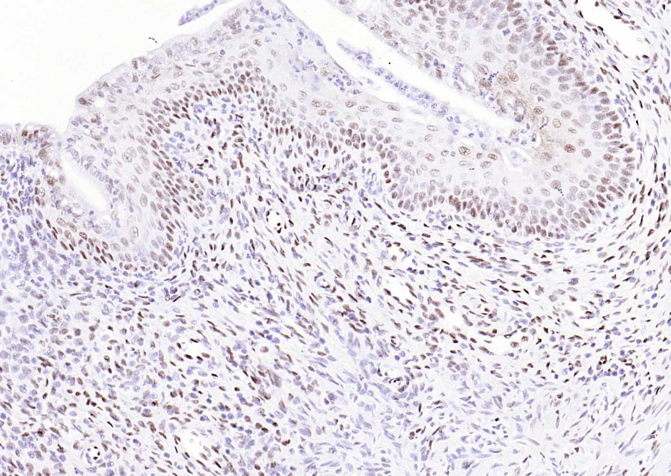 Paraformaldehyde-fixed, paraffin embedded (mouse uterus); Antigen retrieval by boiling in sodium citrate buffer (pH6.0) for 15min; Block endogenous peroxidase by 3% hydrogen peroxide for 20 minutes; Blocking buffer (normal goat serum) at 37°C for 30min; Antibody incubation with (phospho-ATF2 (Thr71)) Monoclonal Antibody, Unconjugated (bsm-52134R) at 1:200 overnight at 4°C, followed by operating according to SP Kit(Rabbit) (sp-0023) instructionsand DAB staining.