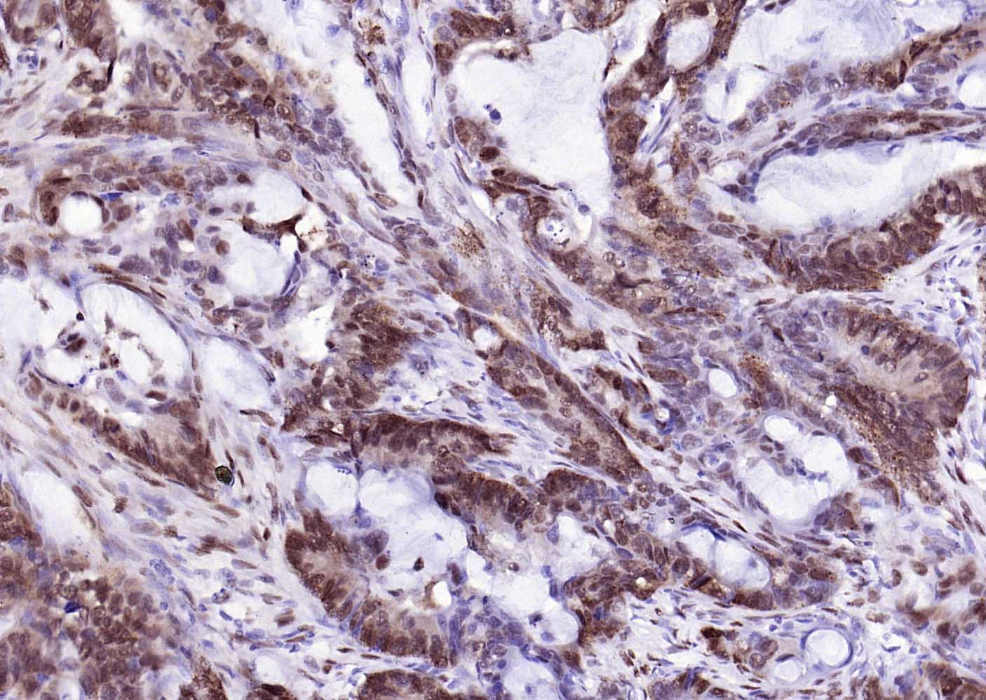 Paraformaldehyde-fixed, paraffin embedded (human colon carcinoma); Antigen retrieval by boiling in sodium citrate buffer (pH6.0) for 15min; Block endogenous peroxidase by 3% hydrogen peroxide for 20 minutes; Blocking buffer (normal goat serum) at 37°C for 30min; Antibody incubation with (phospho-ATF2 (Thr71)) Monoclonal Antibody, Unconjugated (bsm-52134R) at 1:200 overnight at 4°C, followed by operating according to SP Kit(Rabbit) (sp-0023) instructionsand DAB staining.
