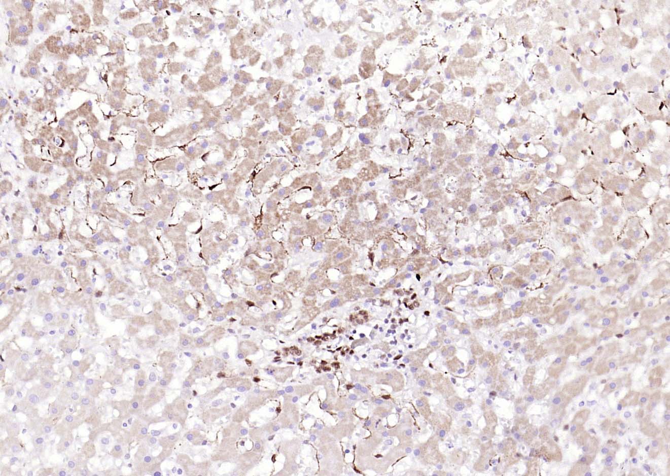 Paraformaldehyde-fixed, paraffin embedded (human liver); Antigen retrieval by boiling in sodium citrate buffer (pH6.0) for 15min; Block endogenous peroxidase by 3% hydrogen peroxide for 20 minutes; Blocking buffer (normal goat serum) at 37°C for 30min; Antibody incubation with (phospho-ATF2 (Thr71)) Monoclonal Antibody, Unconjugated (bsm-52134R) at 1:200 overnight at 4°C, followed by operating according to SP Kit(Rabbit) (sp-0023) instructionsand DAB staining.