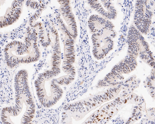 Immunohistochemical analysis of paraffin-embedded human colon carcinoma tissue using anti-Phospho-Cyclin E1(T77) antibody. The section was pre-treated using heat mediated antigen retrieval with sodium citrate buffer (pH 6.0) for 20 minutes. The tissues were blocked in 5% BSA for 30 minutes at room temperature, washed with ddH2O and PBS, and then probed with the primary antibody (bsm-52146R, 1/50) for 30 minutes at room temperature. The detection was performed using an HRP conjugated compact polymer system. DAB was used as the chromogen. Tissues were counterstained with hematoxylin and mounted with DPX.
