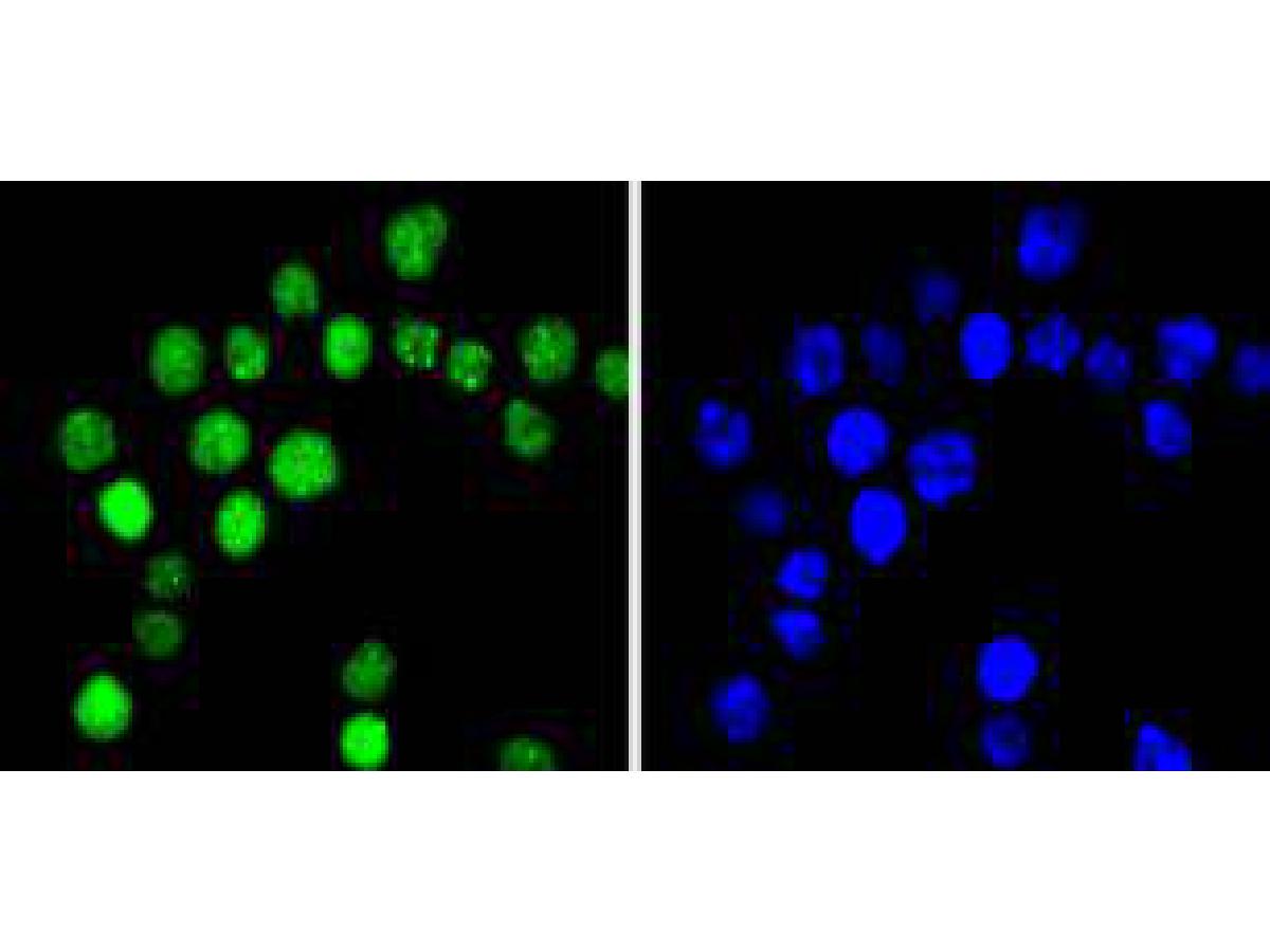 ICC staining of Phospho-Cyclin E1(T77) in SW480 cells (green). Formalin fixed cells were permeabilized with 0.1% Triton X-100 in TBS for 10 minutes at room temperature and blocked with 1% Blocker BSA for 15 minutes at room temperature. Cells were probed with the primary antibody (bsm-52146R, 1/50) for 1 hour at room temperature, washed with PBS. Alexa Fluor?488 Goat anti-Rabbit IgG was used as the secondary antibody at 1/1,000 dilution. The nuclear counter stain is DAPI (blue).