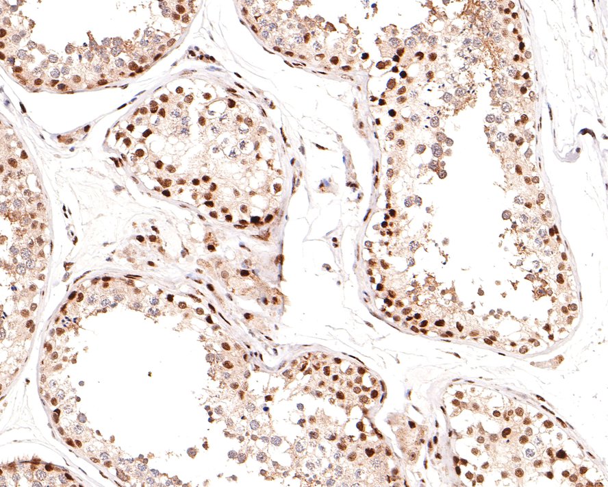 Immunohistochemical analysis of paraffin-embedded human testis tissue using anti-Phospho-Cyclin E1(T77) antibody. The section was pre-treated using heat mediated antigen retrieval with sodium citrate buffer (pH 6.0) for 20 minutes. The tissues were blocked in 1% BSA for 30 minutes at room temperature, washed with ddH2O and PBS, and then probed with the primary antibody (bsm-52146R, 1/400) for 30 minutes at room temperature. The detection was performed using an HRP conjugated compact polymer system. DAB was used as the chromogen. Tissues were counterstained with hematoxylin and mounted with DPX.
