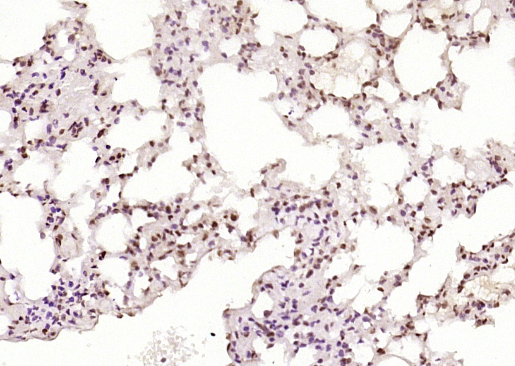 Paraformaldehyde-fixed, paraffin embedded (mouse lung); Antigen retrieval by boiling in sodium citrate buffer (pH6.0) for 15min; Block endogenous peroxidase by 3% hydrogen peroxide for 20 minutes; Blocking buffer (normal goat serum) at 37°C for 30min; Antibody incubation with (phospho-HSF1 (Ser326)) Polyclonal Antibody, Unconjugated (bsm-52166R) at 1:200 overnight at 4°C, followed by operating according to SP Kit(Rabbit) (sp-0023) instructionsand DAB staining.