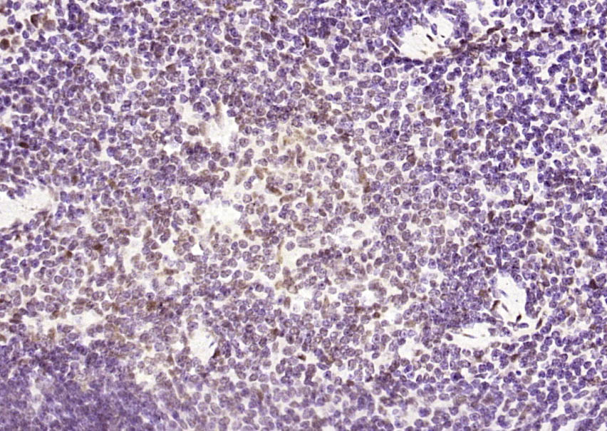 Paraformaldehyde-fixed, paraffin embedded (mouse spleen); Antigen retrieval by boiling in sodium citrate buffer (pH6.0) for 15min; Block endogenous peroxidase by 3% hydrogen peroxide for 20 minutes; Blocking buffer (normal goat serum) at 37°C for 30min; Antibody incubation with (phospho-HSF1 (Ser326)) Polyclonal Antibody, Unconjugated (bsm-52166R) at 1:200 overnight at 4°C, followed by operating according to SP Kit(Rabbit) (sp-0023) instructionsand DAB staining.