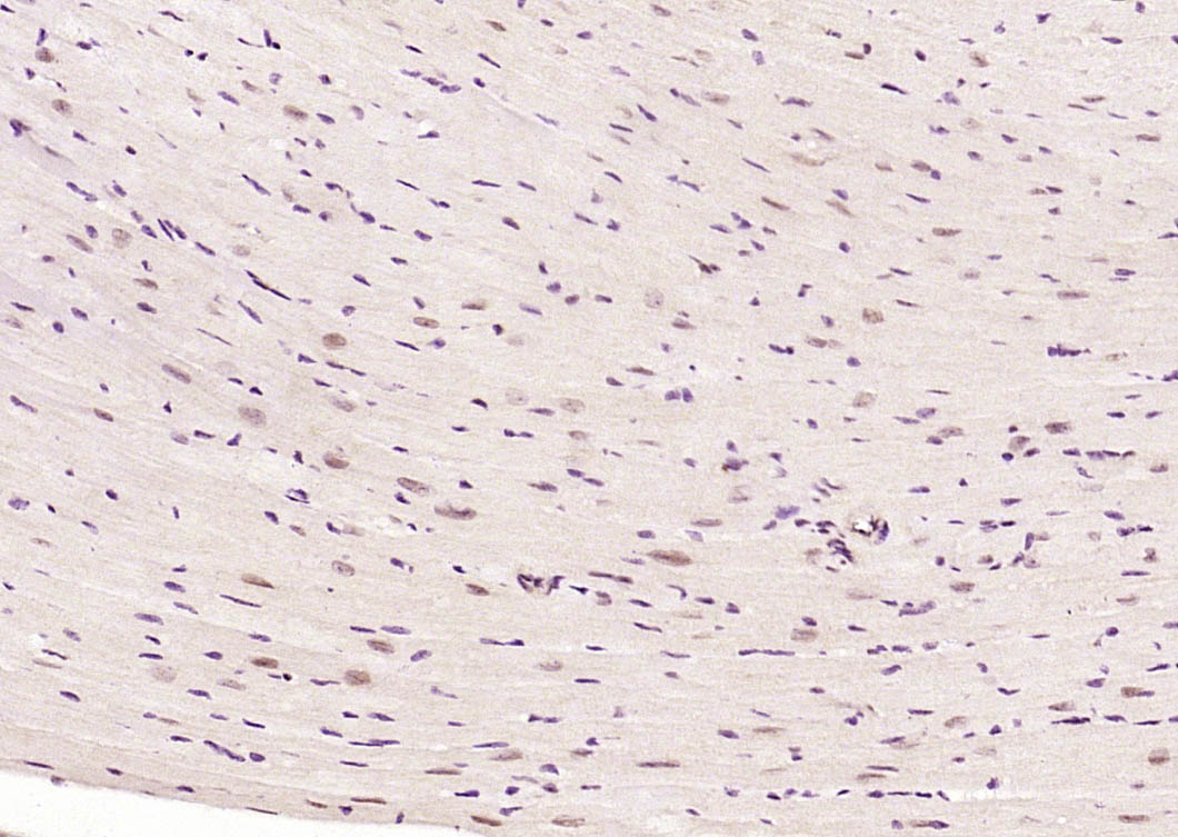 Paraformaldehyde-fixed, paraffin embedded (mouse heart); Antigen retrieval by boiling in sodium citrate buffer (pH6.0) for 15min; Block endogenous peroxidase by 3% hydrogen peroxide for 20 minutes; Blocking buffer (normal goat serum) at 37°C for 30min; Antibody incubation with (phospho-HSF1 (Ser326)) Polyclonal Antibody, Unconjugated (bsm-52166R) at 1:200 overnight at 4°C, followed by operating according to SP Kit(Rabbit) (sp-0023) instructionsand DAB staining.