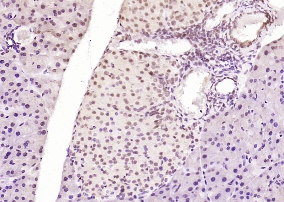 Paraformaldehyde-fixed, paraffin embedded (mouse pancreas); Antigen retrieval by boiling in sodium citrate buffer (pH6.0) for 15min; Block endogenous peroxidase by 3% hydrogen peroxide for 20 minutes; Blocking buffer (normal goat serum) at 37°C for 30min; Antibody incubation with (phospho-HSF1 (Ser326)) Polyclonal Antibody, Unconjugated (bsm-52166R) at 1:200 overnight at 4°C, followed by operating according to SP Kit(Rabbit) (sp-0023) instructionsand DAB staining.