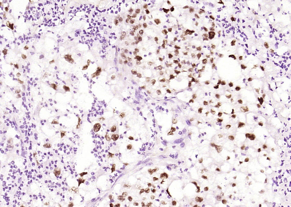 Paraformaldehyde-fixed, paraffin embedded (human colon carcinoma); Antigen retrieval by boiling in sodium citrate buffer (pH6.0) for 15min; Block endogenous peroxidase by 3% hydrogen peroxide for 20 minutes; Blocking buffer (normal goat serum) at 37°C for 30min; Antibody incubation with (phospho-HSF1 (Ser326) ) Monoclonal Antibody, Unconjugated (bsm-52166R) at 1:200 overnight at 4°C, followed by operating according to SP Kit(Rabbit) (sp-0023) instructionsand DAB staining.