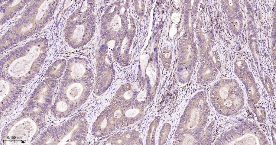 Paraformaldehyde-fixed, paraffin embedded (human colon carcinoma); Antigen retrieval by boiling in sodium citrate buffer (pH6.0) for 15min; Block endogenous peroxidase by 3% hydrogen peroxide for 20 minutes; Blocking buffer (normal goat serum) at 37°C for 30min; Antibody incubation with (Phospho-PKR (Thr446)) Monoclonal Antibody, Unconjugated (bsm-52189R) at 1:200 overnight at 4°C, followed by operating according to SP Kit(Rabbit) (sp-0023) instructionsand DAB staining.