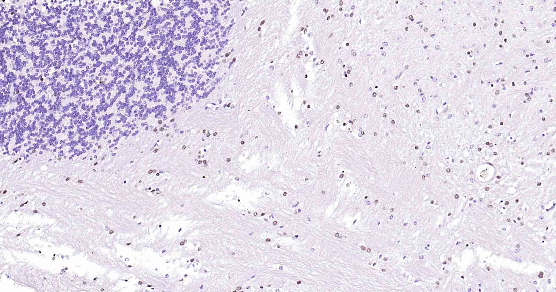 Paraformaldehyde-fixed, paraffin embedded Mouse Cerebellum; Antigen retrieval by boiling in sodium citrate buffer (pH6.0) for 15 min; Antibody incubation with SOX10 Monoclonal Antibody, Unconjugated(bsm-52229R) at 1:200 overnight at 4°C, followed by conjugation to the SP Kit(Rabbit, SP-0023) and DAB (C-0010) staining.