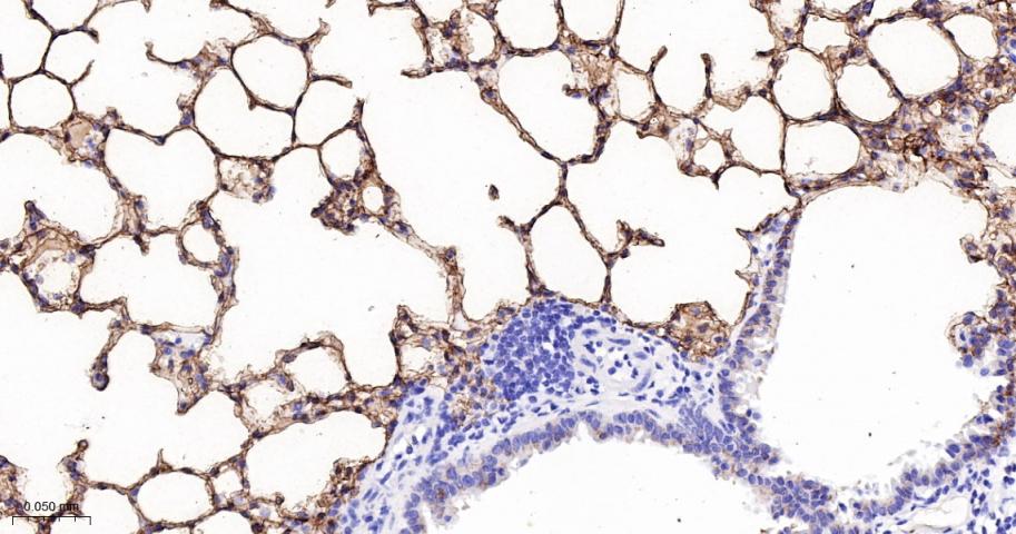 Paraformaldehyde-fixed, paraffin embedded Mouse Lung; Antigen retrieval by boiling in sodium citrate buffer (pH6.0) for 15 min; The section was incubated with RAGE Monoclonal Antibody, Unconjugated (bsm-52809R) at 1:200 overnight at 4°C, followed by conjugation to the bs-0295G-HRP and DAB (C-0010) staining.