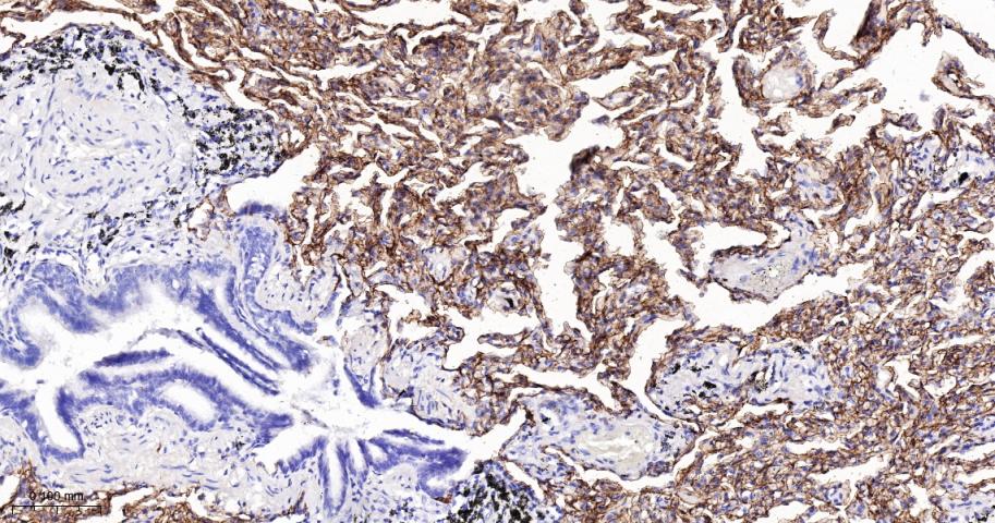 Paraformaldehyde-fixed, paraffin embedded Human Lung; Antigen retrieval by boiling in sodium citrate buffer (pH6.0) for 15 min; The section was incubated with RAGE Monoclonal Antibody, Unconjugated (bsm-52809R) at 1:200 overnight at 4°C, followed by conjugation to the bs-0295G-HRP and DAB (C-0010) staining.