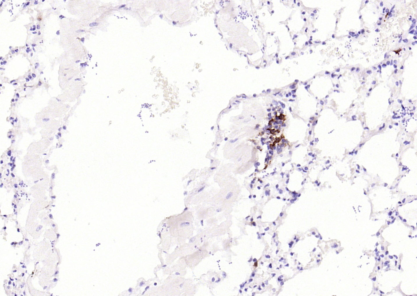 Paraformaldehyde-fixed, paraffin embedded (mouse lung); Antigen retrieval by boiling in sodium citrate buffer (pH6.0) for 15min; Block endogenous peroxidase by 3% hydrogen peroxide for 20 minutes; Blocking buffer (normal goat serum) at 37°C for 30min; Antibody incubation with (HLA-DQA1) Monoclonal Antibody, Unconjugated (bsm-54201R) at 1:200 overnight at 4°C, followed by operating according to SP Kit(Rabbit) (sp-0023) instructionsand DAB staining.