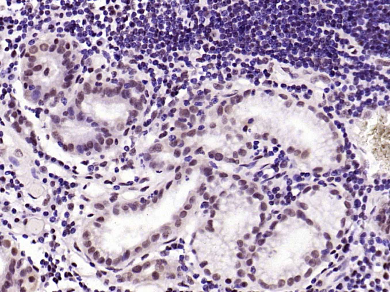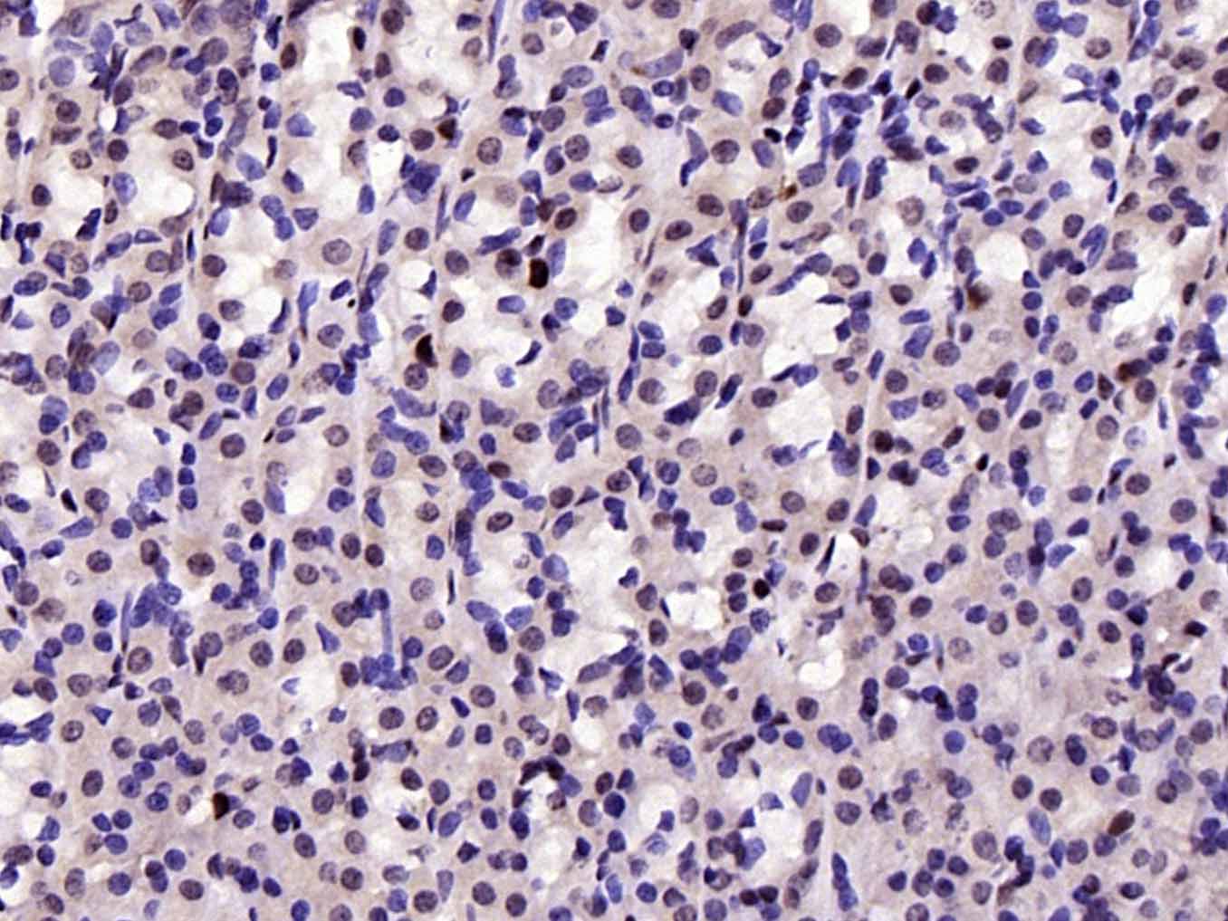 Paraformaldehyde-fixed, paraffin embedded (human gastric); Antigen retrieval by boiling in sodium citrate buffer (pH6.0) for 15min; Block endogenous peroxidase by 3% hydrogen peroxide for 20 minutes; Blocking buffer (normal goat serum) at 37°C for 30min; Antibody incubation with (KLF4) Monoclonal Antibody, Unconjugated (bsm-52850R ) at 1:200 overnight at 4°C, followed by operating according to SP Kit(Rabbit) (sp-0023) instructionsand DAB staining.