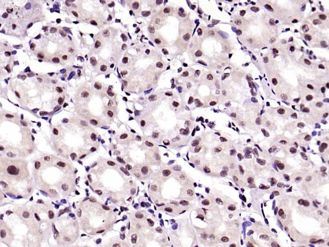 Paraformaldehyde-fixed, paraffin embedded (rat stomach); Antigen retrieval by boiling in sodium citrate buffer (pH6.0) for 15min; Block endogenous peroxidase by 3% hydrogen peroxide for 20 minutes; Blocking buffer (normal goat serum) at 37°C for 30min; Antibody incubation with (KLF4) Monoclonal Antibody, Unconjugated (bsm-52850R ) at 1:200 overnight at 4°C, followed by operating according to SP Kit(Rabbit) (sp-0023) instructionsand DAB staining.