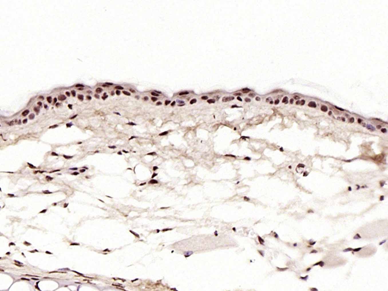 Paraformaldehyde-fixed, paraffin embedded (mouse skin); Antigen retrieval by boiling in sodium citrate buffer (pH6.0) for 15min; Block endogenous peroxidase by 3% hydrogen peroxide for 20 minutes; Blocking buffer (normal goat serum) at 37°C for 30min; Antibody incubation with (KLF4) Monoclonal Antibody, Unconjugated (bsm-52850R ) at 1:200 overnight at 4°C, followed by operating according to SP Kit(Rabbit) (sp-0023) instructionsand DAB staining.