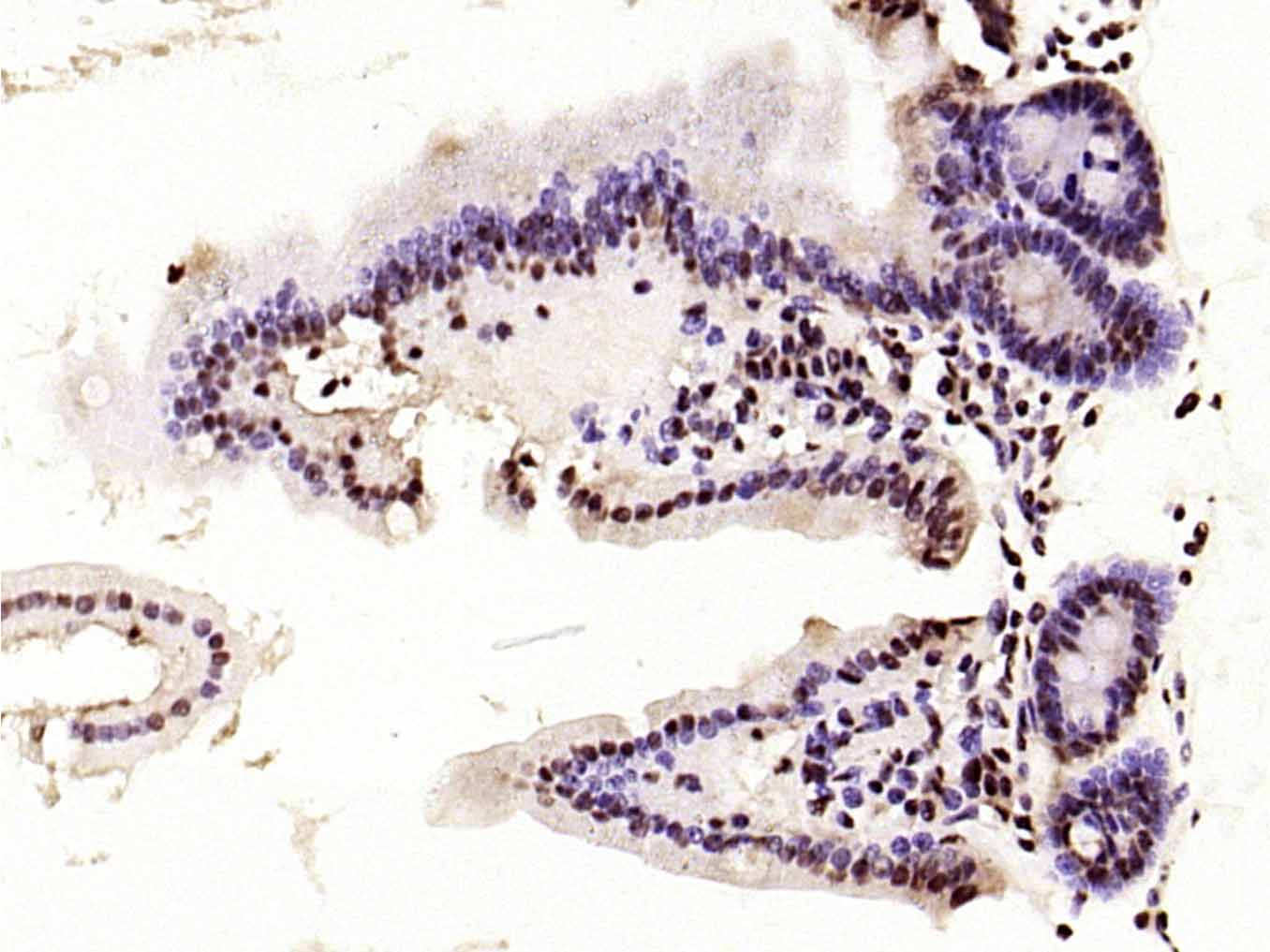 Paraformaldehyde-fixed, paraffin embedded (mouse intestine); Antigen retrieval by boiling in sodium citrate buffer (pH6.0) for 15min; Block endogenous peroxidase by 3% hydrogen peroxide for 20 minutes; Blocking buffer (normal goat serum) at 37°C for 30min; Antibody incubation with (KLF4) Monoclonal Antibody, Unconjugated (bsm-52850R ) at 1:200 overnight at 4°C, followed by operating according to SP Kit(Rabbit) (sp-0023) instructionsand DAB staining.