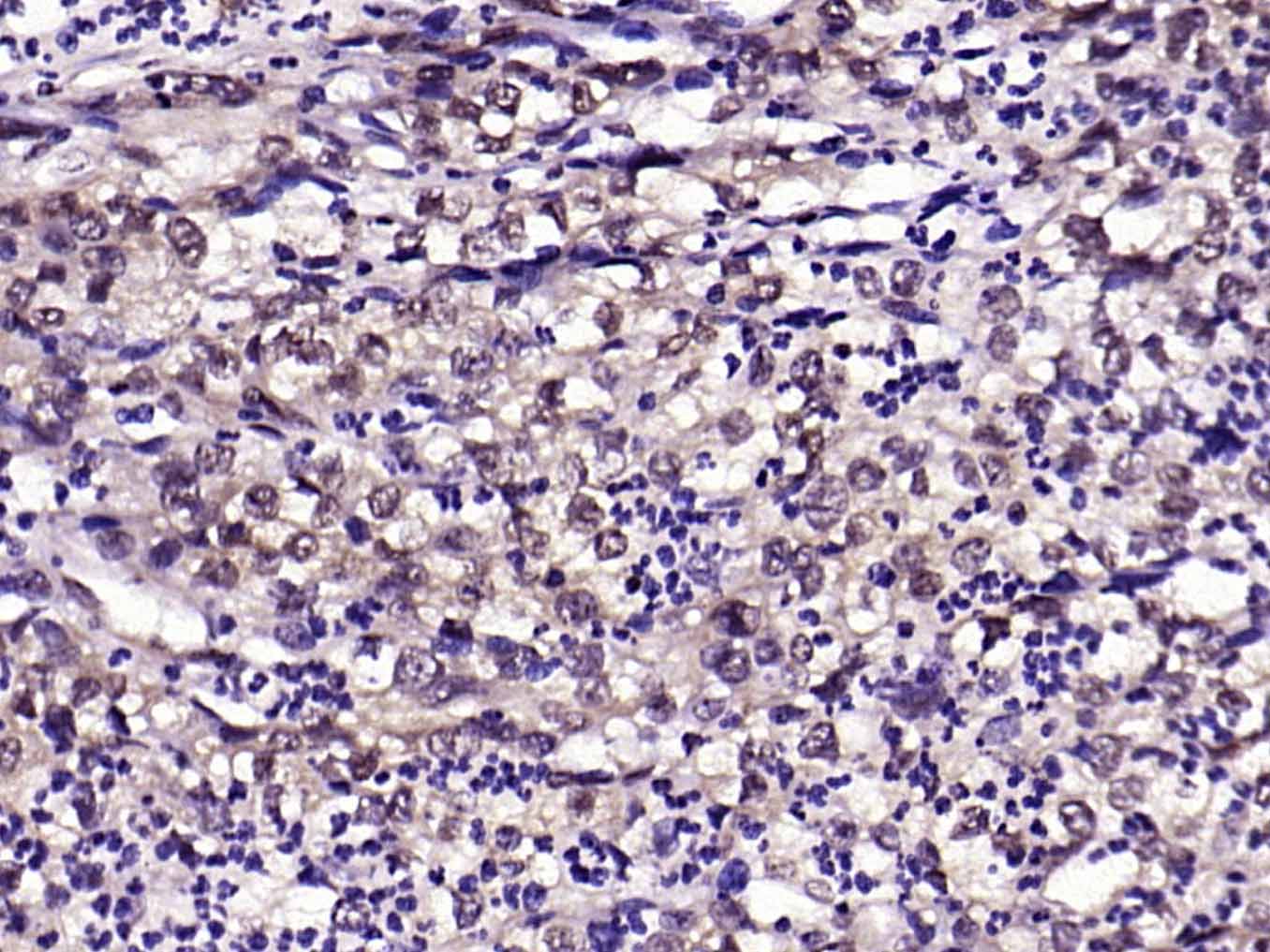 Paraformaldehyde-fixed, paraffin embedded (human gastric carcinoma); Antigen retrieval by boiling in sodium citrate buffer (pH6.0) for 15min; Block endogenous peroxidase by 3% hydrogen peroxide for 20 minutes; Blocking buffer (normal goat serum) at 37°C for 30min; Antibody incubation with (KLF4) Monoclonal Antibody, Unconjugated (bsm-52850R ) at 1:200 overnight at 4°C, followed by operating according to SP Kit(Rabbit) (sp-0023) instructionsand DAB staining.