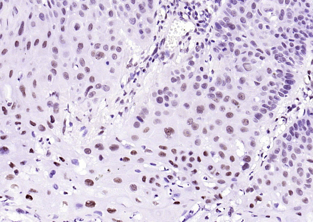 Paraformaldehyde-fixed, paraffin embedded (human laryngeal carcinoma); Antigen retrieval by boiling in sodium citrate buffer (pH6.0) for 15min; Block endogenous peroxidase by 3% hydrogen peroxide for 20 minutes; Blocking buffer (normal goat serum) at 37°C for 30min; Antibody incubation with (KLF4) Monoclonal Antibody, Unconjugated (bsm-52850R) at 1:200 overnight at 4°C, followed by operating according to SP Kit(Rabbit) (sp-0023) instructionsand DAB staining.