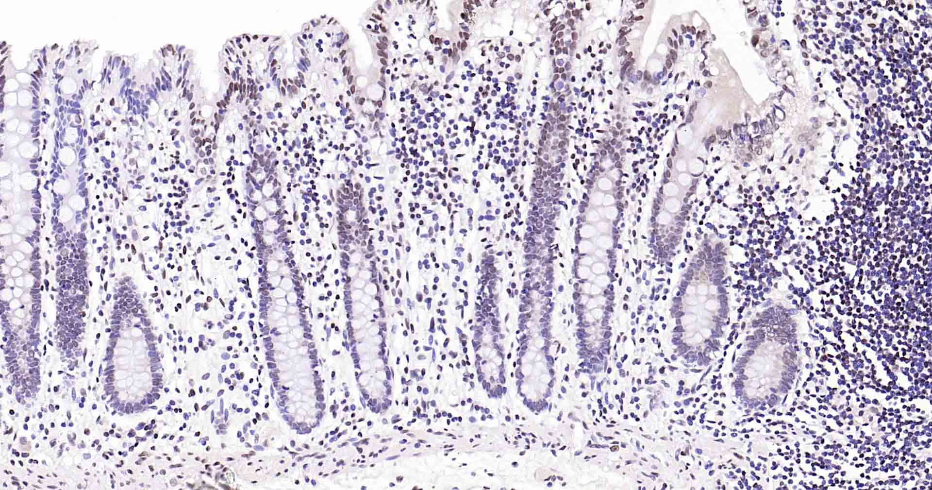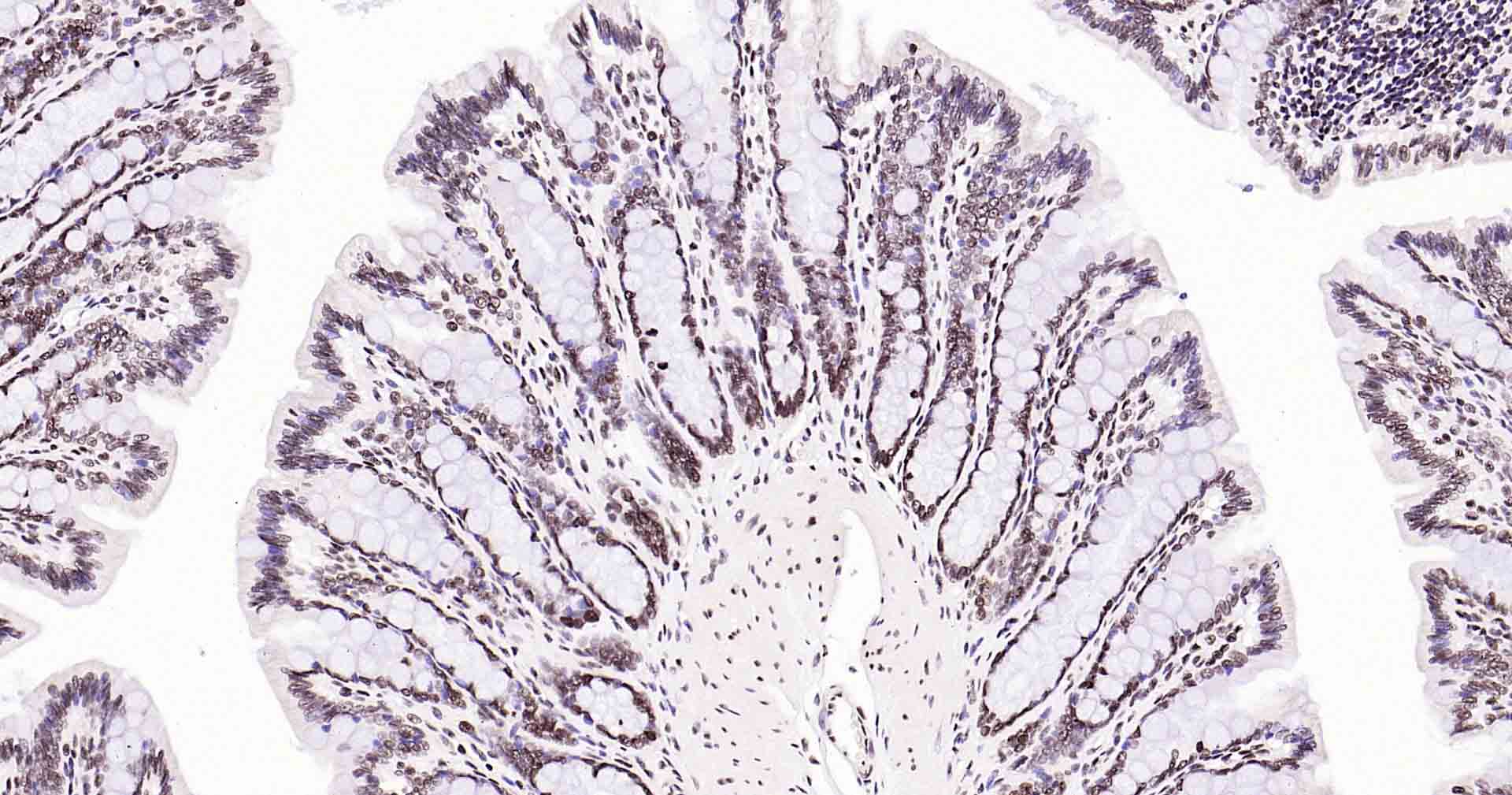 Paraformaldehyde-fixed, paraffin embedded Mouse Colon; Antigen retrieval by boiling in sodium citrate buffer (pH6.0) for 15 min; Antibody incubation with Rad51 Monoclonal Antibody, Unconjugated(bsm-54150R) at 1:200 overnight at 4°C, followed by conjugation to the SP Kit (Rabbit, SP-0023) and DAB (C-0010) staining.