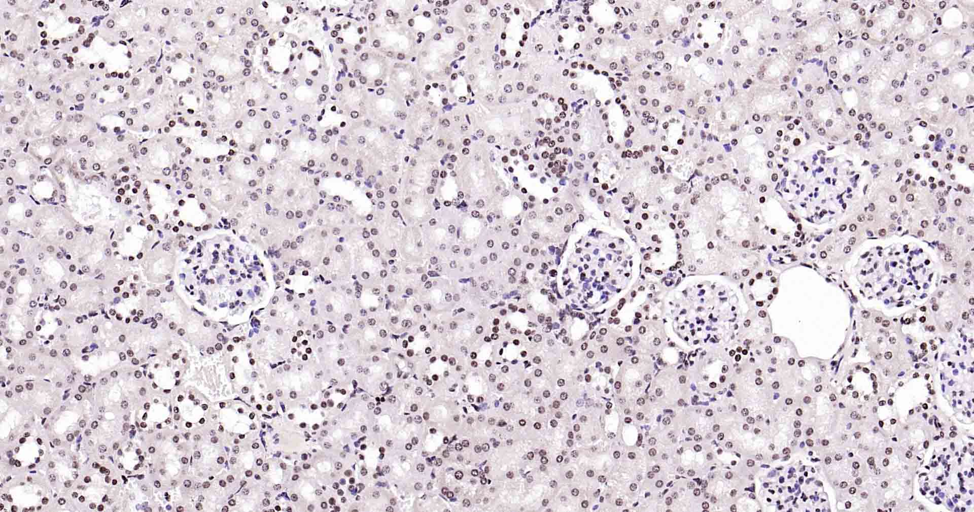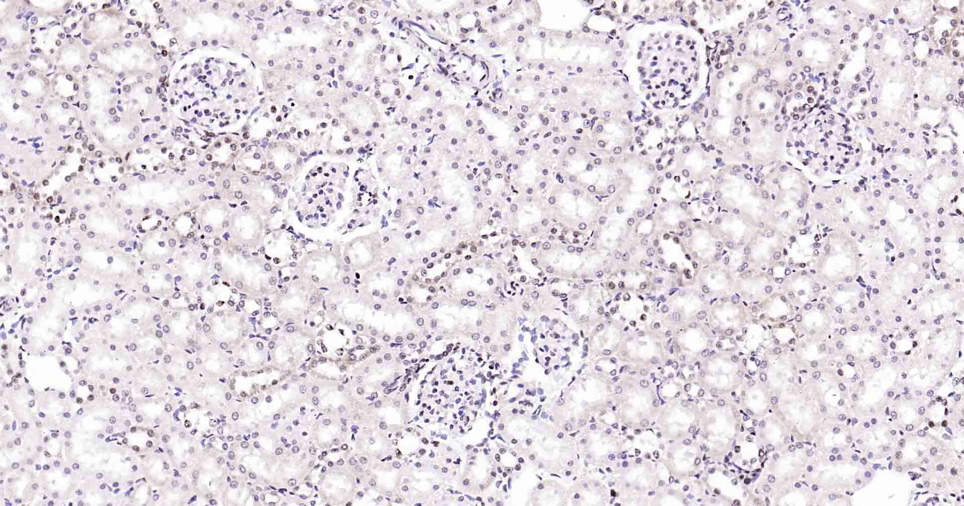 Paraformaldehyde-fixed, paraffin embedded Mouse Kidney; Antigen retrieval by boiling in sodium citrate buffer (pH6.0) for 15 min; Antibody incubation with Rad51 Monoclonal Antibody, Unconjugated(bsm-54150R) at 1:200 overnight at 4°C, followed by conjugation to the SP Kit (Rabbit, SP-0023) and DAB (C-0010) staining.