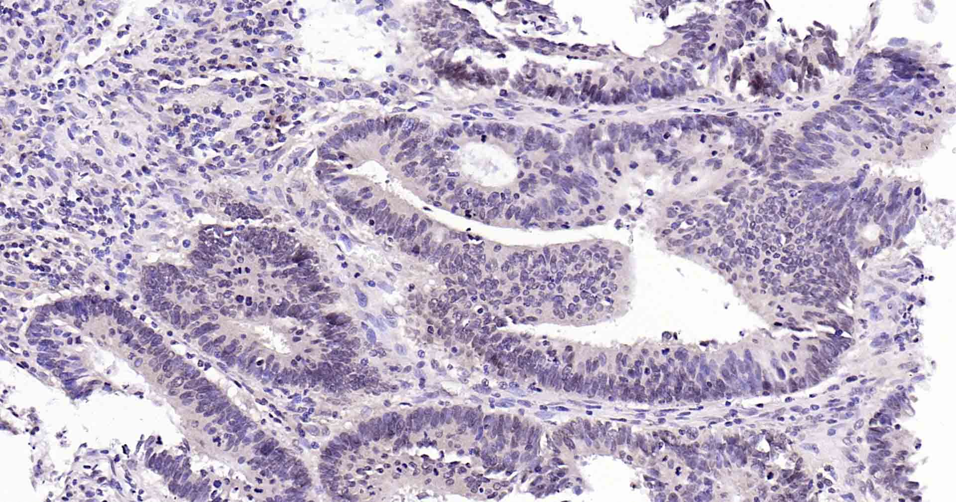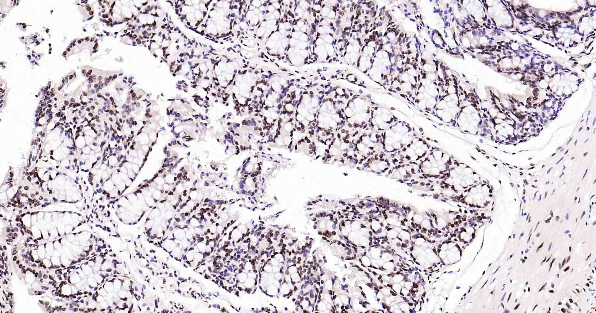 Paraformaldehyde-fixed, paraffin embedded Human Colon Cancer; Antigen retrieval by boiling in sodium citrate buffer (pH6.0) for 15 min; Antibody incubation with Rad51 Monoclonal Antibody, Unconjugated(bsm-54150R) at 1:200 overnight at 4°C, followed by conjugation to the SP Kit (Rabbit, SP-0023) and DAB (C-0010) staining.