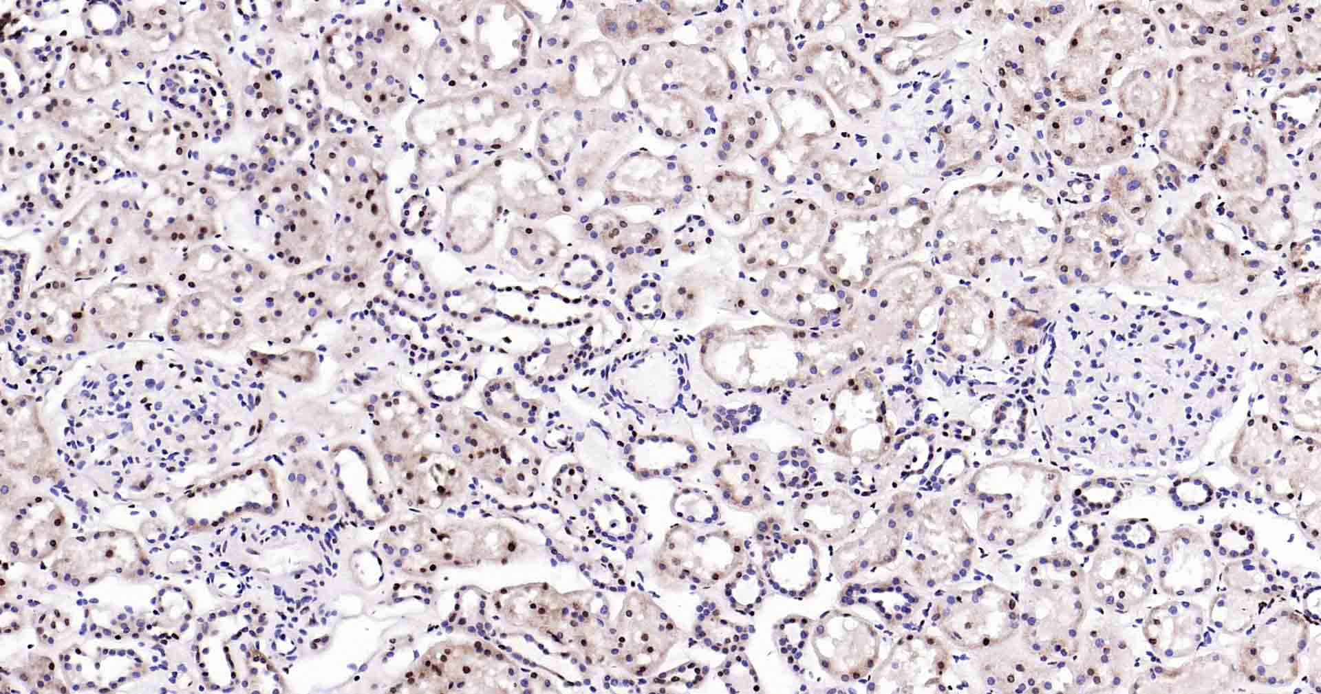 Paraformaldehyde-fixed, paraffin embedded Humann Kidney; Antigen retrieval by boiling in sodium citrate buffer (pH6.0) for 15 min; Antibody incubation with Rad51 Monoclonal Antibody, Unconjugated(bsm-54150R) at 1:200 overnight at 4°C, followed by conjugation to the SP Kit (Rabbit, SP-0023) and DAB (C-0010) staining.
