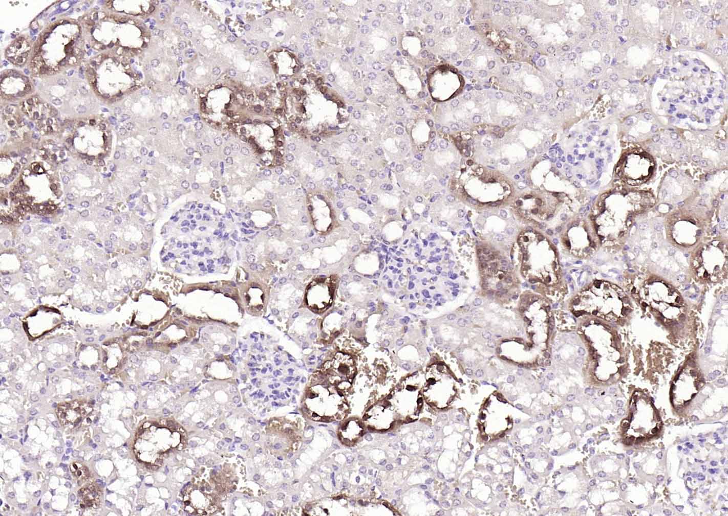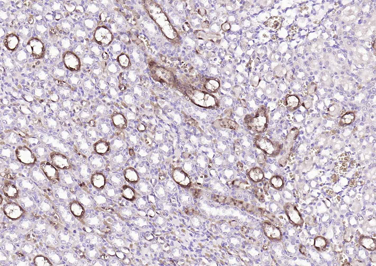 Paraformaldehyde-fixed, paraffin embedded (mouse kidney); Antigen retrieval by boiling in sodium citrate buffer (pH6.0) for 15min; Block endogenous peroxidase by 3% hydrogen peroxide for 20 minutes; Blocking buffer (normal goat serum) at 37°C for 30min; Incubation with (S100A1 ) Polyclonal Antibody, Unconjugated (bs-41209R) at 1:200 overnight at 4°C, followed by operating according to SP Kit(Rabbit) (sp-0023) instructionsand DAB staining.