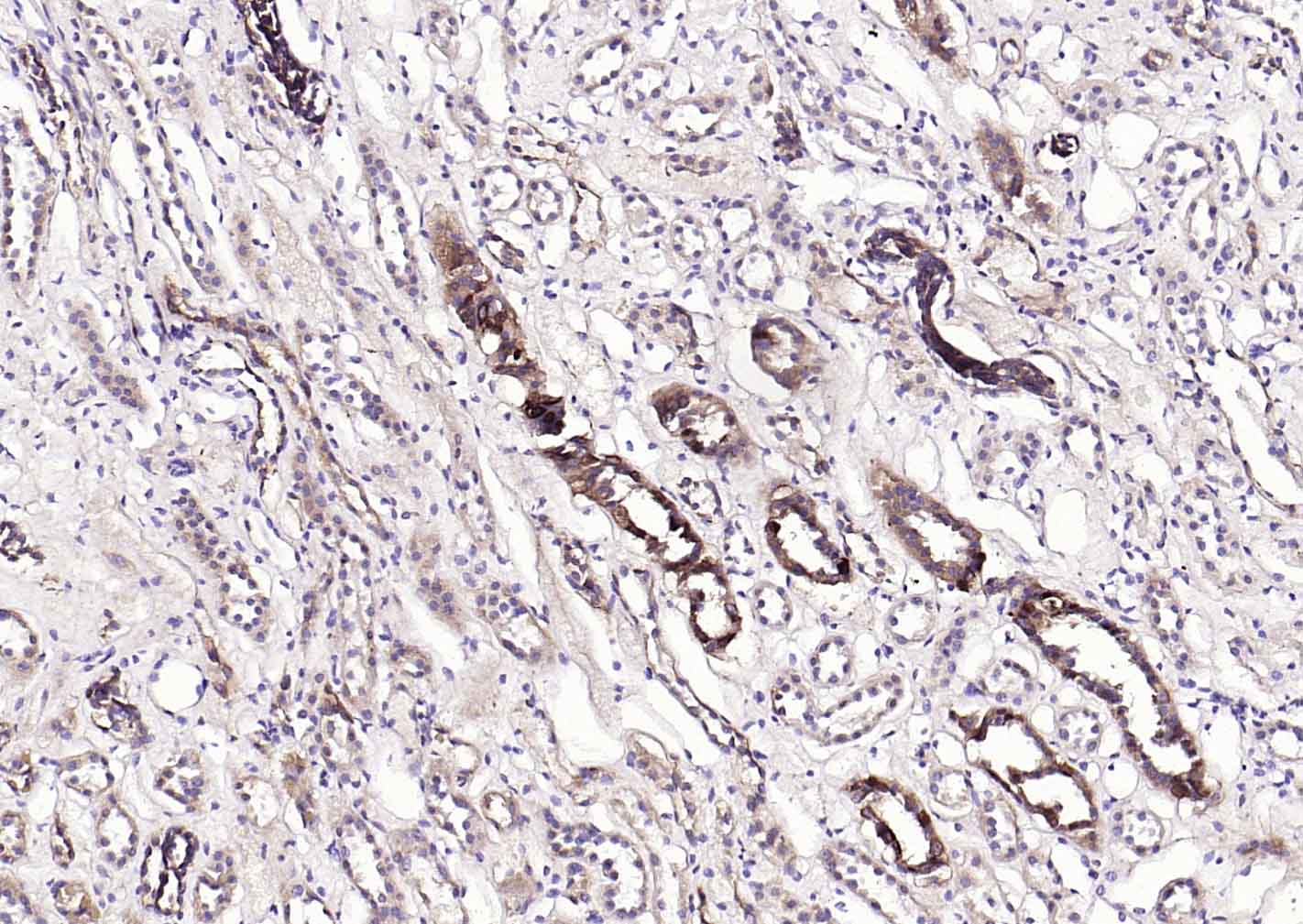 Paraformaldehyde-fixed, paraffin embedded (human kidney); Antigen retrieval by boiling in sodium citrate buffer (pH6.0) for 15min; Block endogenous peroxidase by 3% hydrogen peroxide for 20 minutes; Blocking buffer (normal goat serum) at 37°C for 30min; Incubation with (S100A1 ) Polyclonal Antibody, Unconjugated (bs-41209R) at 1:200 overnight at 4°C, followed by operating according to SP Kit(Rabbit) (sp-0023) instructionsand DAB staining.