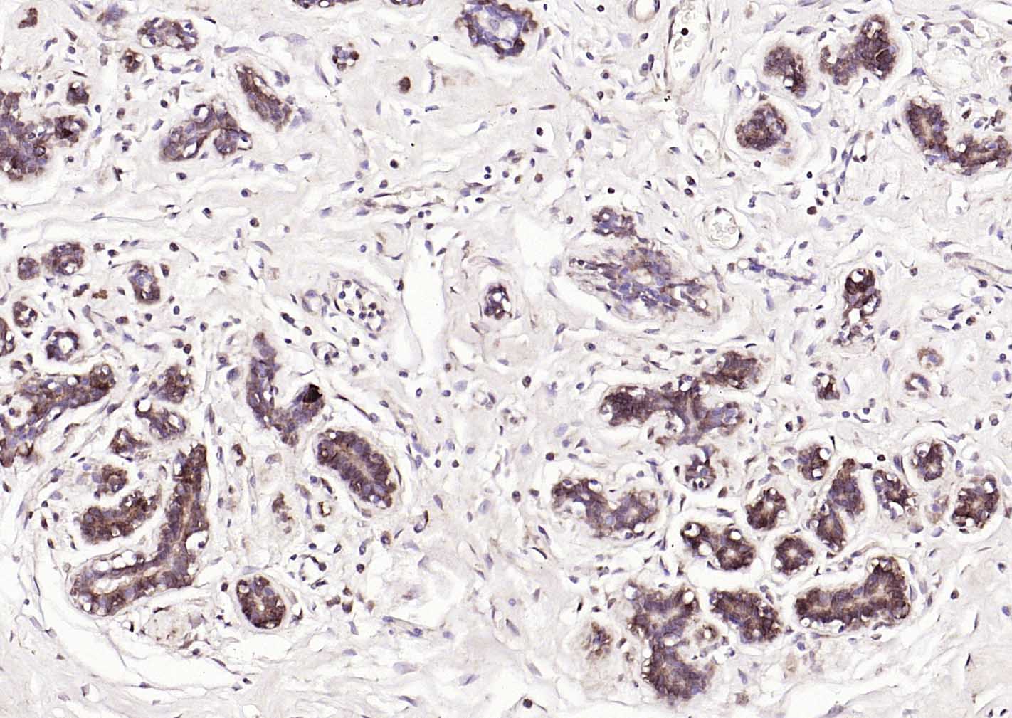 Paraformaldehyde-fixed, paraffin embedded (human breast); Antigen retrieval by boiling in sodium citrate buffer (pH6.0) for 15min; Block endogenous peroxidase by 3% hydrogen peroxide for 20 minutes; Blocking buffer (normal goat serum) at 37°C for 30min; Incubation with (S100A1 ) Polyclonal Antibody, Unconjugated (bs-41209R) at 1:200 overnight at 4°C, followed by operating according to SP Kit(Rabbit) (sp-0023) instructionsand DAB staining.