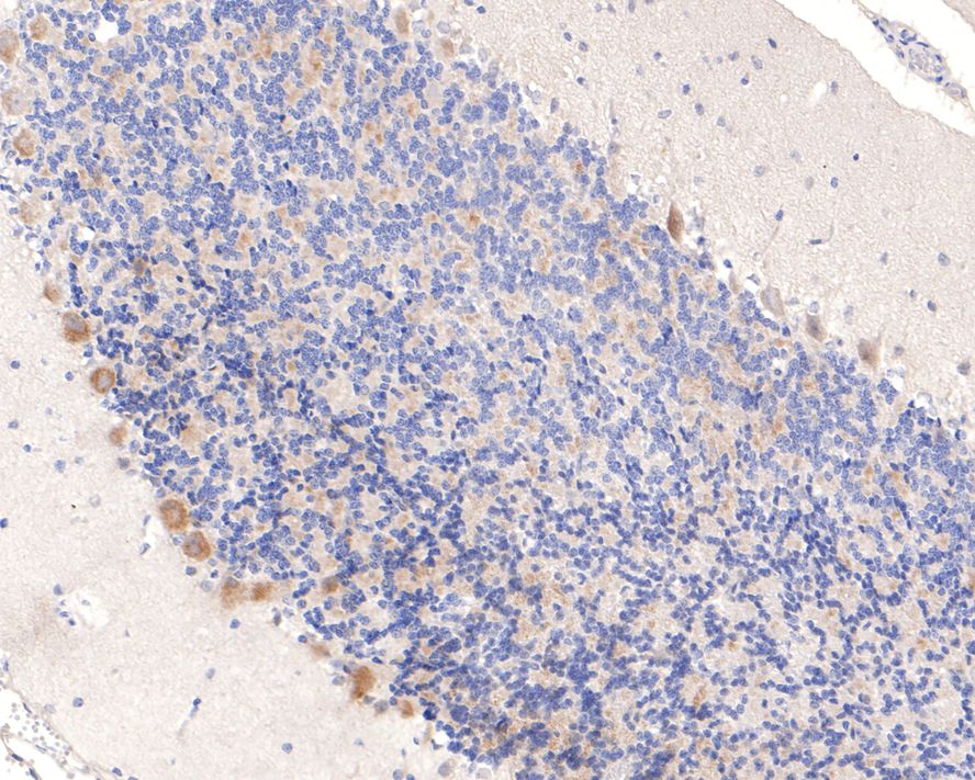 Immunohistochemical analysis of paraffin-embedded rat cerebellum tissue with Rabbit anti-IKK gamma antibody (bsm-54012R) at 1/400 dilution.